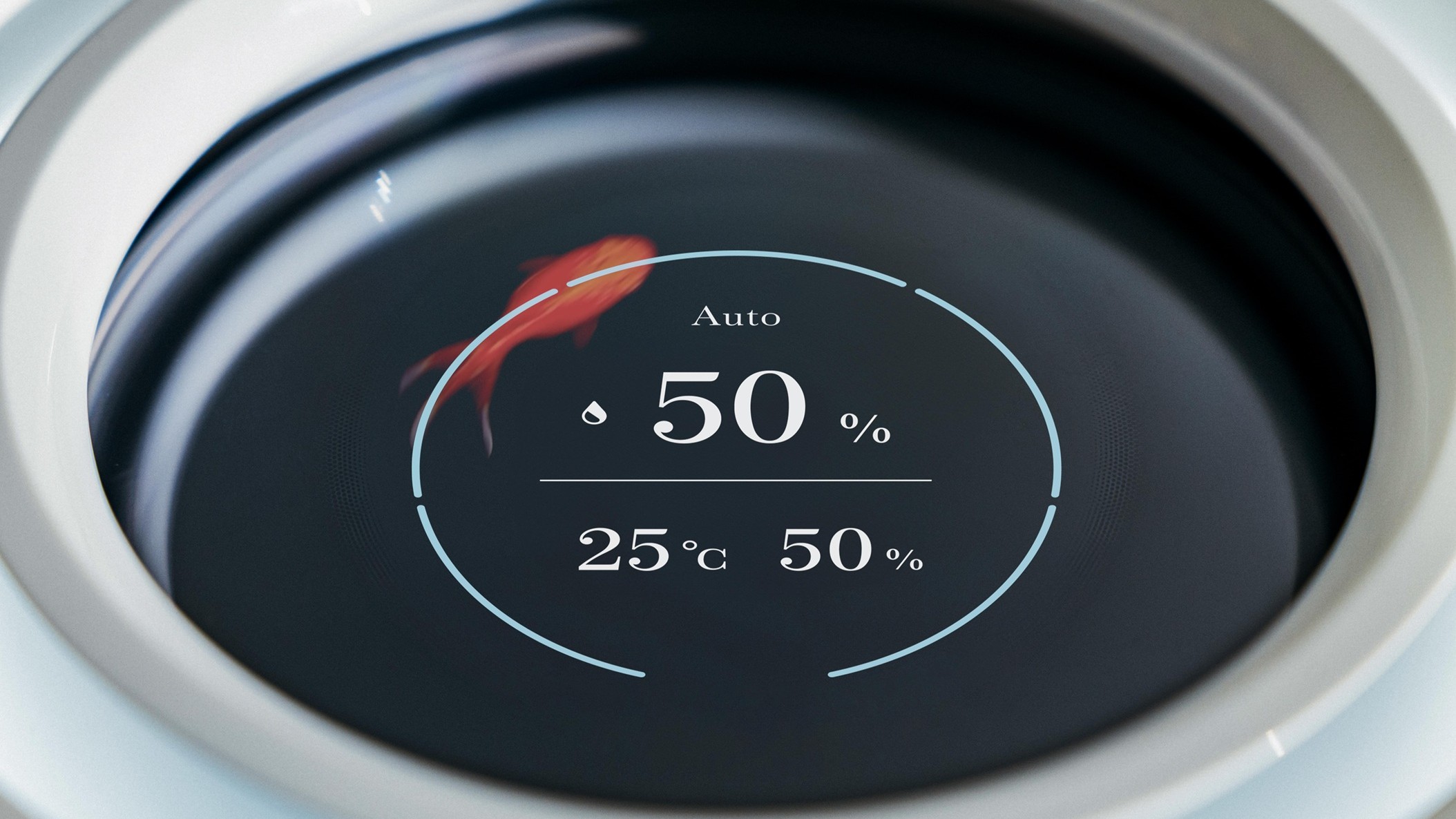 新モデルでは、高精細ディスプレイを採用し、使いやすさと美しさを刷新。現在の室温、湿度、タンク容量などの情報をわかりやすく表示するほか、水を注いだ際などには、金魚またはもみじのシンボルが現れ、豊かな印象を与える。