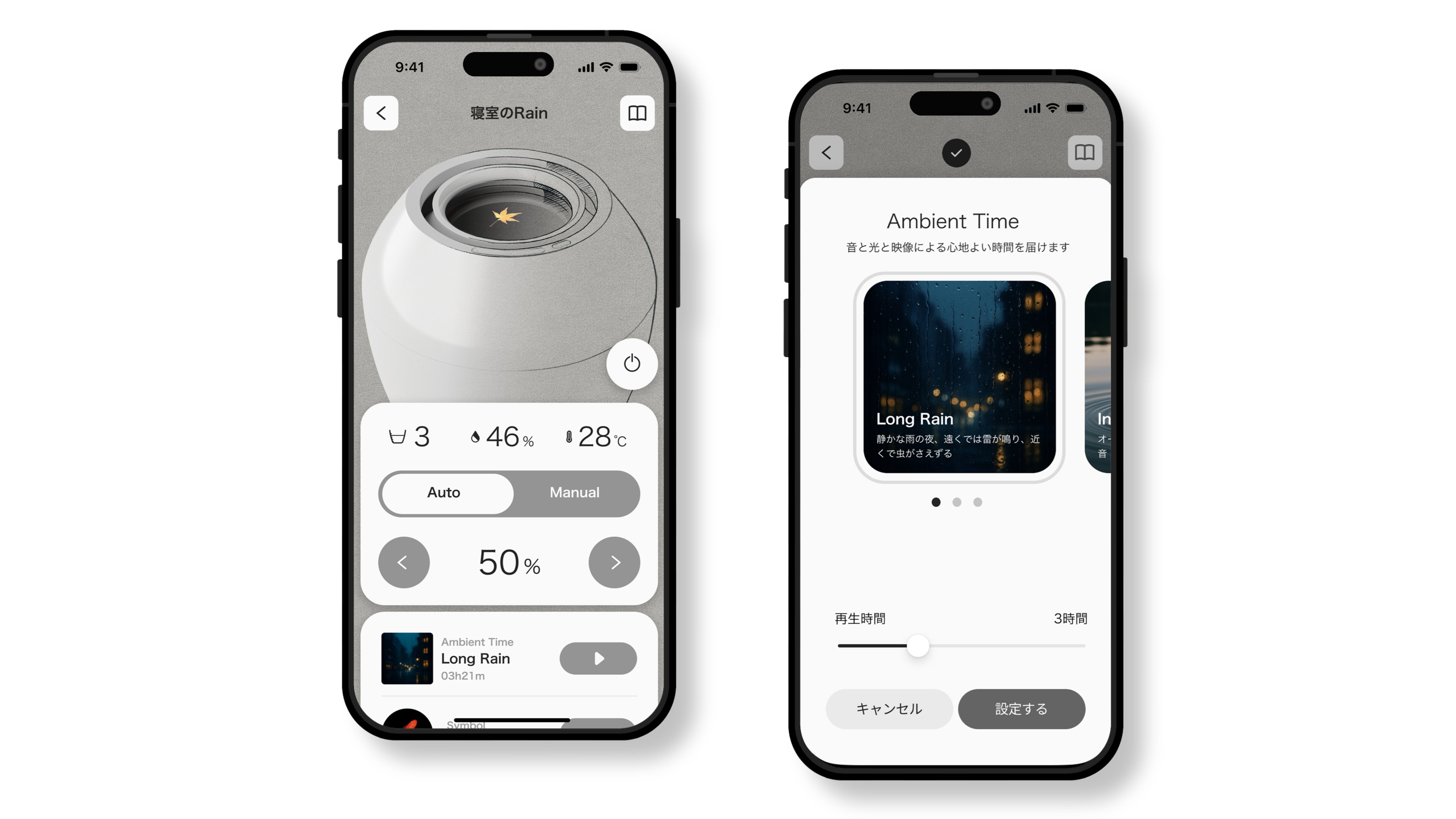 さらに、新機能「Ambient Time」では、自然をテーマにした心地よいサウンドとディスプレイに流れる映像、やわらかい光の組合せにより、リラックスタイムを演出。なお、Ambient Timeのテーマは、コオロギの鳴き声が流れる「Long Rain」、手漕ぎボートのオールが心地よく水面を叩く「Infinity Boat」、日本の原風景を思い起こす、せせらぎや虫の声「Satoyama」の3種類から選択可能だ。