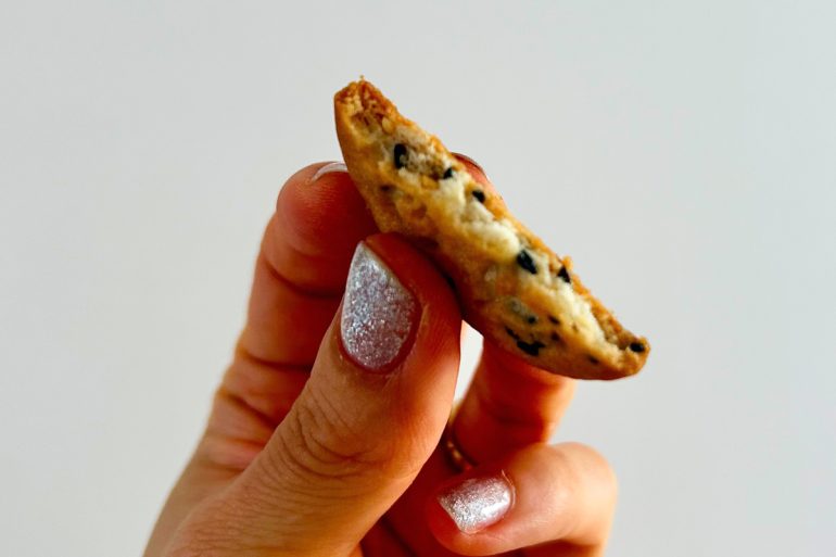 「とくに黒ごまは、開発中に『もっとごまの風味を感じたい』という声が上がり、ふんだんに加えました。断面を見ていただくと、ごまがたっぷり入っていることがわかると思います。小腹を満たしたり軽い朝食に、そのまま召し上がってもおいしいですが、バニラアイスを挟むと背徳的なおいしさです!」