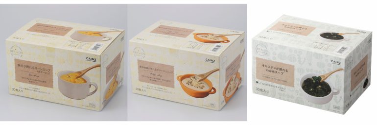 (1) 鉄分が摂れるコーンスープ、食物繊維が摂れるポタージュ、オルニチンが摂れるわかめスープ(各30食入り 980円・税込)