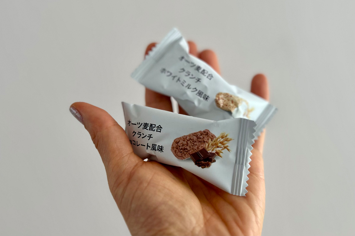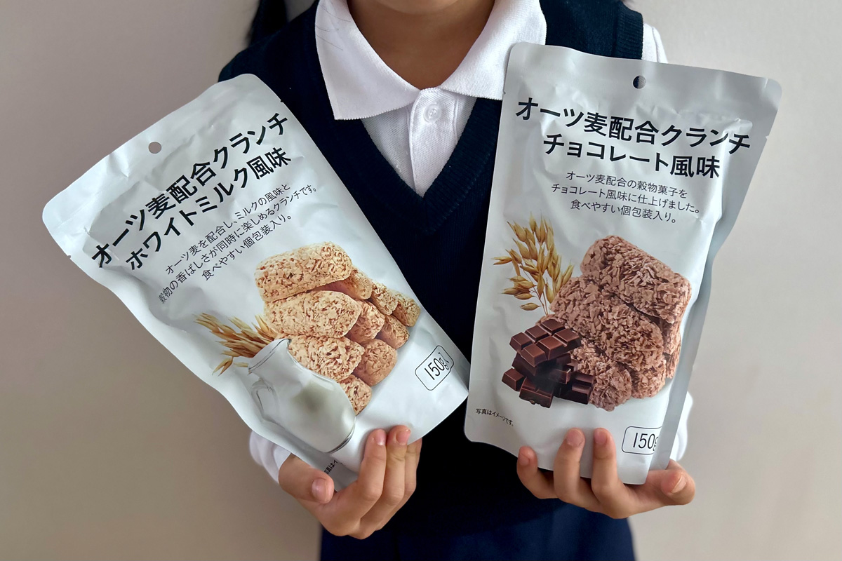 2025年に発売された、2フレーバーの『オーツ麦配合クランチ』。健康意識の高まりに応えるべく、腸内環境を整えるなどといったことにも役立つ〝オーツ麦〟を取り入れたお菓子として誕生した。