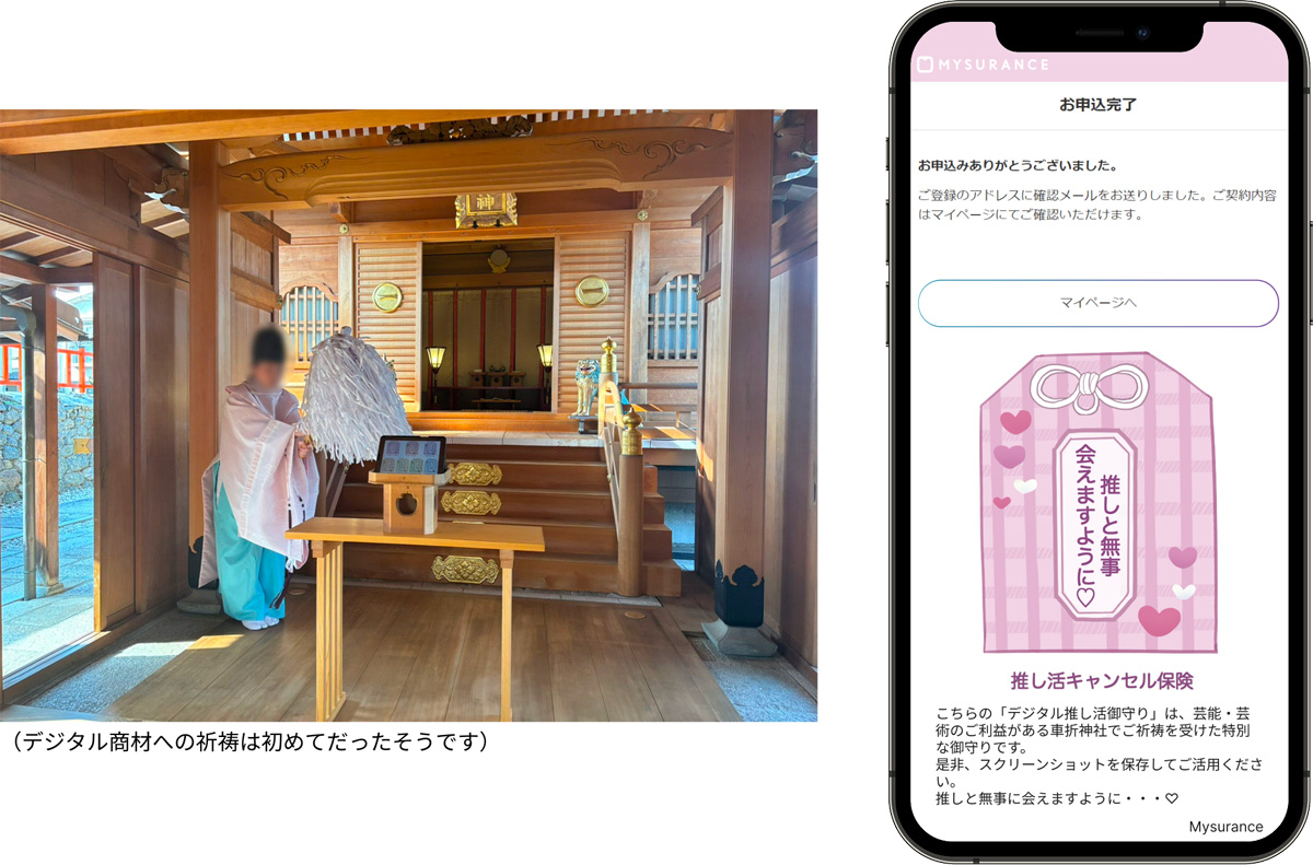 保険金を請求するときは、残念ながら推しに会えなかったとき。そのジレンマを解消するべく、「デジタル推し活御守り」の提供を始めたと続ける。