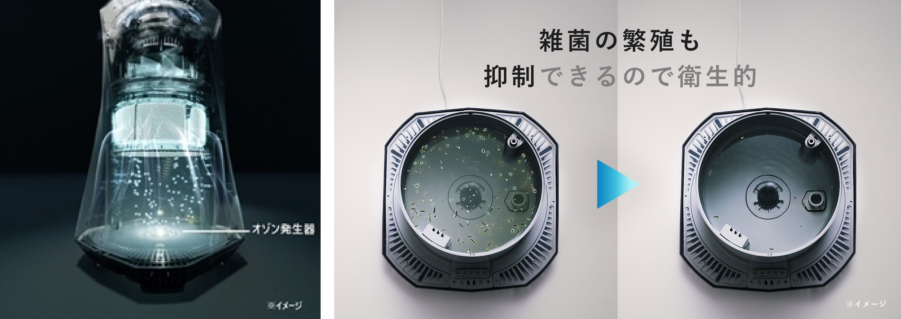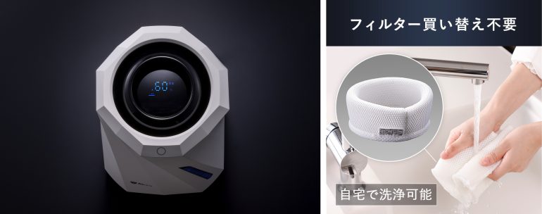 加えて、2025年モデルでは、タンク水残量が一目でわかるインジケーターや、真上から水を注げる便利な設計はそのままに、湿度や運転モード、給水タイミングなどが一目で確認できるよう、上部液晶モニターを設置。さらに、水洗いできるフィルターは本体に設置しやすい形状にすることで、お手入れ時のストレスを低減する。
