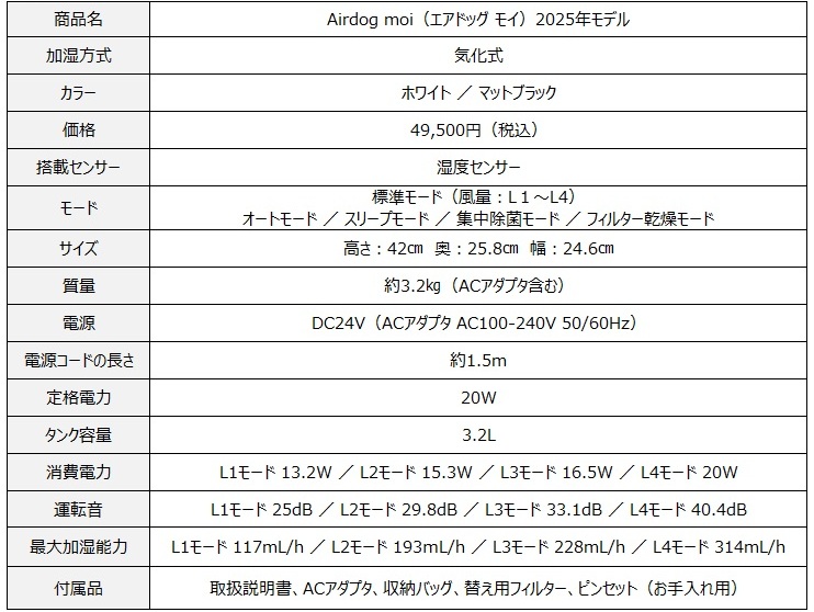 エアドッグジャパンは、気化式加湿器「Airdog moi」の2025年モデルを販売開始した。価格は49,500円。カラーはホワイトとマットブラックの2色を用意する。