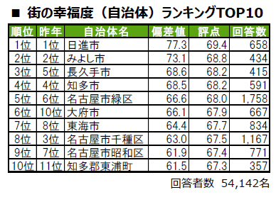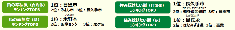 街の幸福度(自治体)ランキングにおいて、トップ2は3年連続で、1位が日進市、2位がみよし市となり、今年も偏差値70台の高い評価を得ている。3位は昨年5位から順位を上げた長久手市で、「住みここち」をはじめとする4つのランキングで1位の高い評価を得ている。