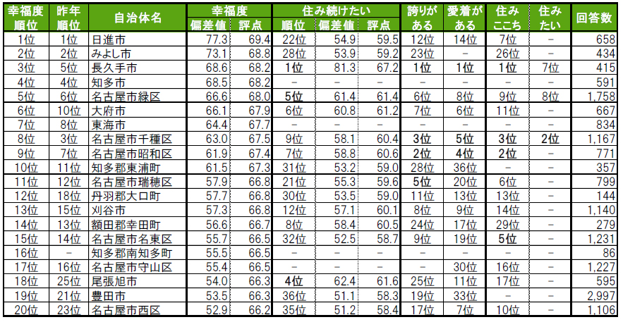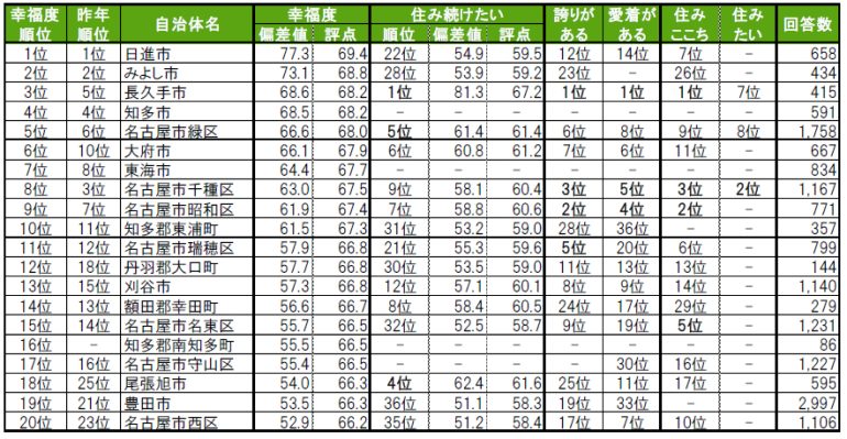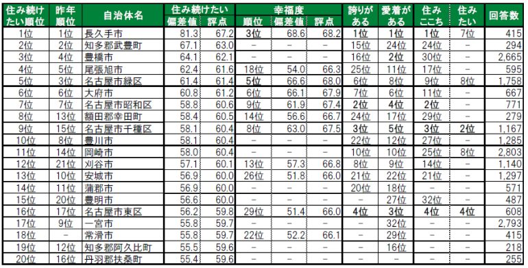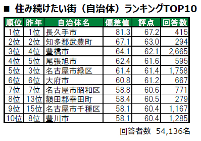 住み続けたい街(自治体)ランキングにおいて、1位は5年連続で長久手市となり、唯一偏差値80台の極めて高い評価を得ている。2位は、3年連続で知多郡武豊町。3位は、昨年4位から一つ順位を上げた豊橋市となった。トップ10内では、8位の額田郡幸田町(昨年13位)、9位の名古屋市千種区(昨年15位)が、昨年から順位を上げてトップ10入りしている。