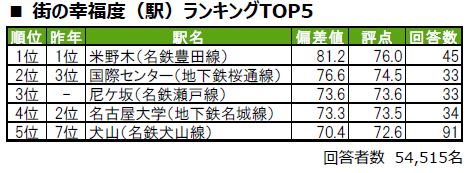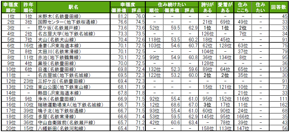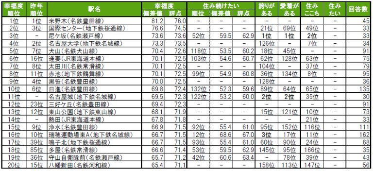 街の幸福度(駅)ランキングでは、日進市に位置する米野木が、唯一偏差値80台の極めて高い評価を得て、3年連続で1位に輝いた。2位は、昨年3位から1つ順位を上げた名古屋市中村区に位置する国際センター。3位は初登場の名古屋市北区に位置する尼ケ坂で、昨年は累計回答者数が30名未満でランキングの集計対象外だった。その他トップ10内では、6位の刈谷市に位置する逢妻が、昨年16位から順位を上げてトップ10入りしている。