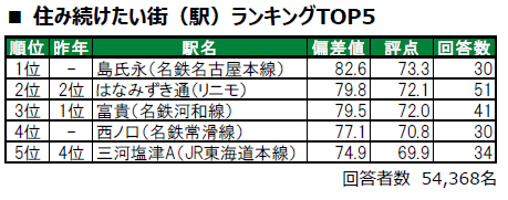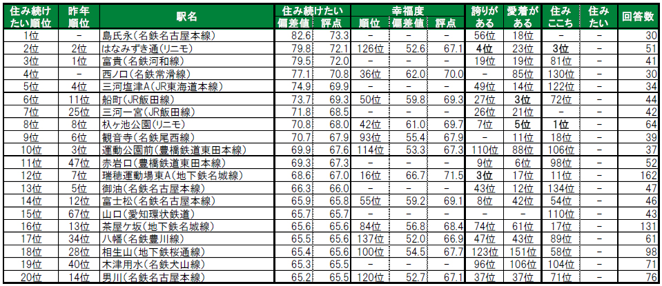 住み続けたい街(駅)ランキングにおいて、1位は初登場の島氏永となり、昨年は累計回答者数が30名未満でランキングの集計対象外となった。2位は、2年連続で長久手市に位置するはなみずき通。3位は、知多郡武豊町に位置する富貴となった。