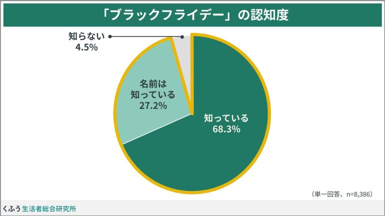 「ブラックフライデー」について、「知っている」(68.3%)「名前は知っている」(27.2%)を合わせた95.5%が認知している結果となった。