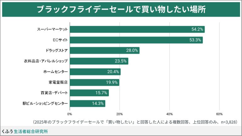 買い物したい場所は「スーパーマーケット」(54.2%)が最も多く、「ECサイト」(53.3%)が僅差で続いた。「ドラッグストア」(28.0%)、「衣料品店・アパレルショップ」(23.5%)、「ホームセンター」(20.4%)も2割以上の人が選択しており、生活者がさまざまな業態のブラックフライデーセールを期待していることがわかる。