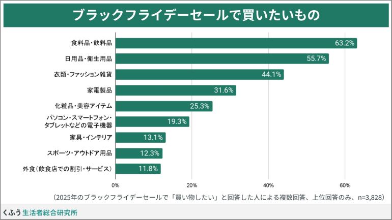 買いたいものは「食料品・飲料品」(63.2%)が最も多く、「日用品・衛生用品」(55.7%)が続いた。ブラックフライデーセールにおいては、家電や家具、パソコンなどの高額商品よりも日常的に必要なものを購入したい生活者が多いことがわかる。