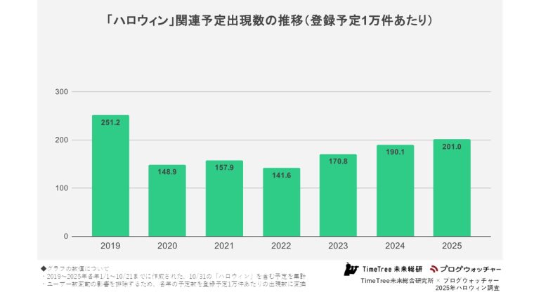 2019年から2025年各年の10月31日に登録された「ハロウィン」関連の予定数を集計したところ、2025年の登録予定1万件あたりの「ハロウィン」関連予定数は201.0件となり、コロナ禍で落ち込みを見せた2020年以降最も多くなる結果が得られた。