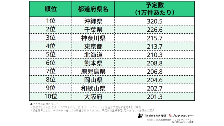 TimeTree未来総研では、昨年10月にもハロウィンに関する調査を実施しております。前回の調査では、ハロウィンを楽しむのが10代の若年層から子育て層に移り変わりつつある兆しをお知らせしましたが、今回のブログウォッチャー社との共同調査では、「位置情報」に着目し、ハロウィンの予定が多い都道府県として沖縄県が際立っていることや、規制の取り組みで注目される渋谷が未だ根強くハロウィンのスポットとして受け入れられていることが明らかになりました。