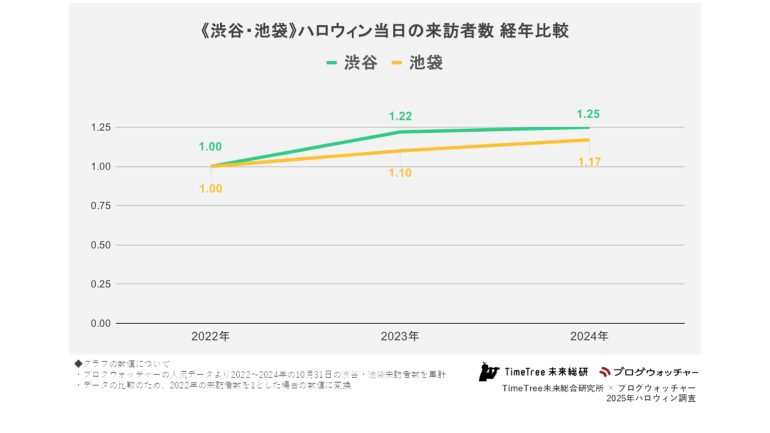 まず、ブログウォッチャーの人流データからハロウィン当日の来訪者数の推移を2022年比(指数)で分析すると、新型コロナウイルスが5類感染症に移行した2023年には、渋谷が122%、池袋が110%とそれぞれ大幅に増加した。