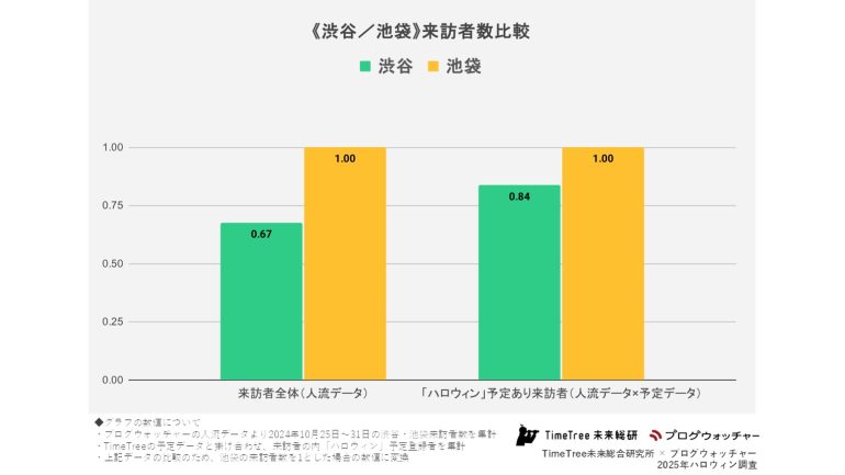 その結果、人流データのみから見た2都市の来訪者数全体のデータでは、渋谷の来訪者数は池袋の約67%にとどまっていた。しかし、「ハロウィン」関連の予定がある来訪者においては、渋谷の来訪者数は池袋の約84%まで伸びていた。