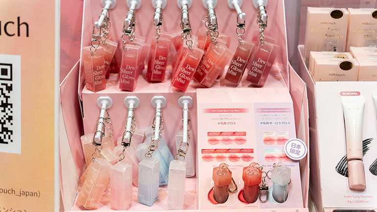 最初にノベルティやサンプルとしてミニコスメを作り、それを製品化した事例もある。Milk Touchは2025年春に渋谷ロフトでポップアップストアを行い、その時にミニサイズの「デューステインシアーグロス ミニ キーリング」をノベルティとしてプレゼントした。