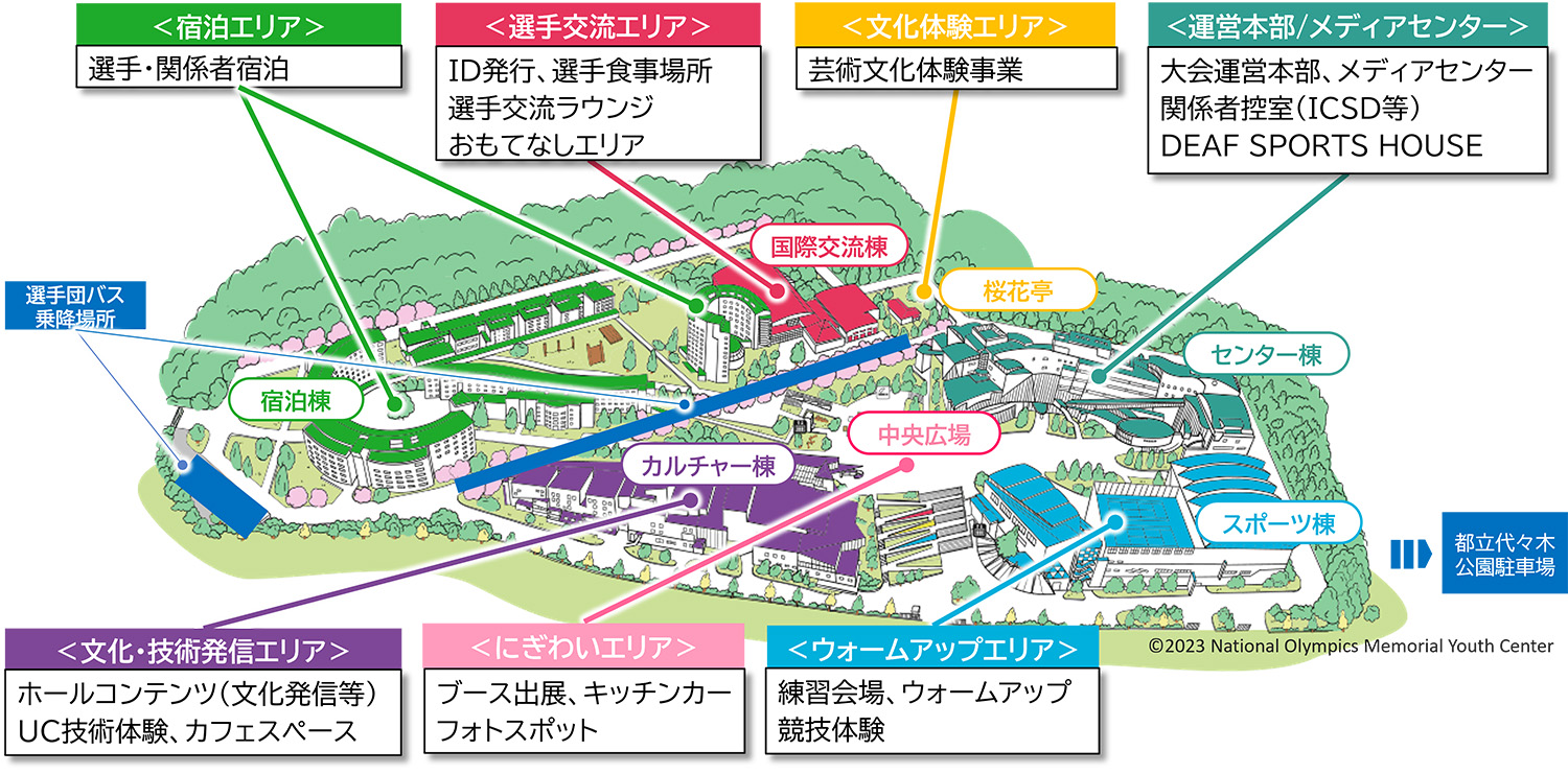 1964年の東京オリンピックの際に選手村の一部として設けられ、現在「国立オリンピック記念青少年総合センター」となっている場所に〝デフリンピックスクエア〟が設置されます。大会運営本部やメディアセンター、選手のウォームアップエリア等の大会運営拠点としての機能に加えて、一般の方が楽しめるスペースが設けられます。ろう者の文化や日本の伝統芸能の発信などを実施するホールコンテンツに加え、最新のUC技術を体験できる「みるTech」、カフェスペースなども設置、スタンプラリーやヘブンアーティストによるパフォーマンスも実施します。選手が立ち寄るエリアになりますので、交流できる機会があるかもしれません。