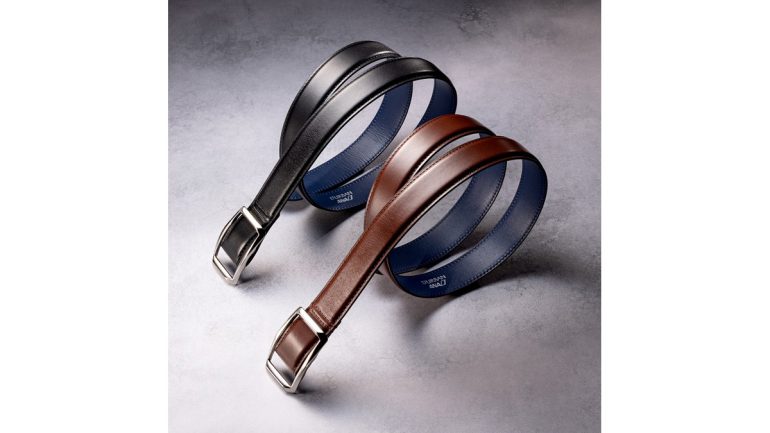 ベルトは、ビジネススタイルにマッチし、かつ使い勝手の良いものを目指し、ベルトピンのない無段階調整タイプを開発した。好みの位置で留めることができる優れものだ。