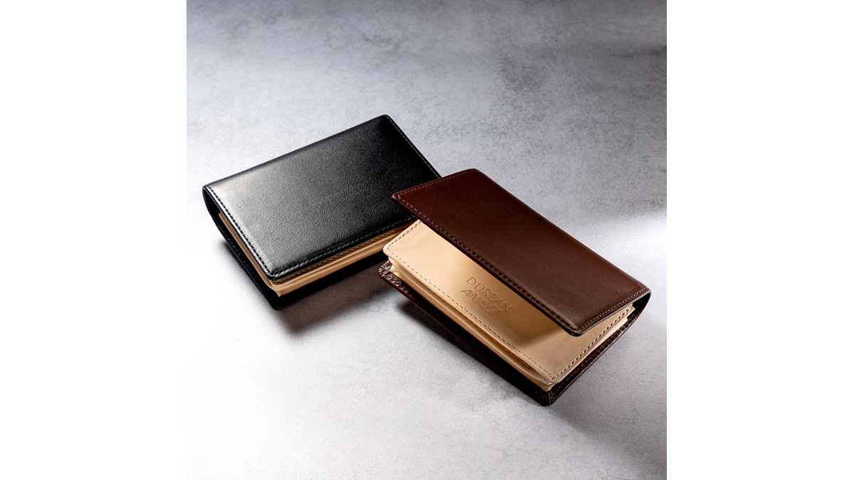 財布とカードケースの表面のレザーは兵庫県姫路市でなめされたきめ細やかなレザーを敢えて職人が手揉みを施し、独特のシボ感を楽しめる。内側の革はヨーロッパ産の白ヌメを使用。使い込むほどに飴色に仕上がっていく。