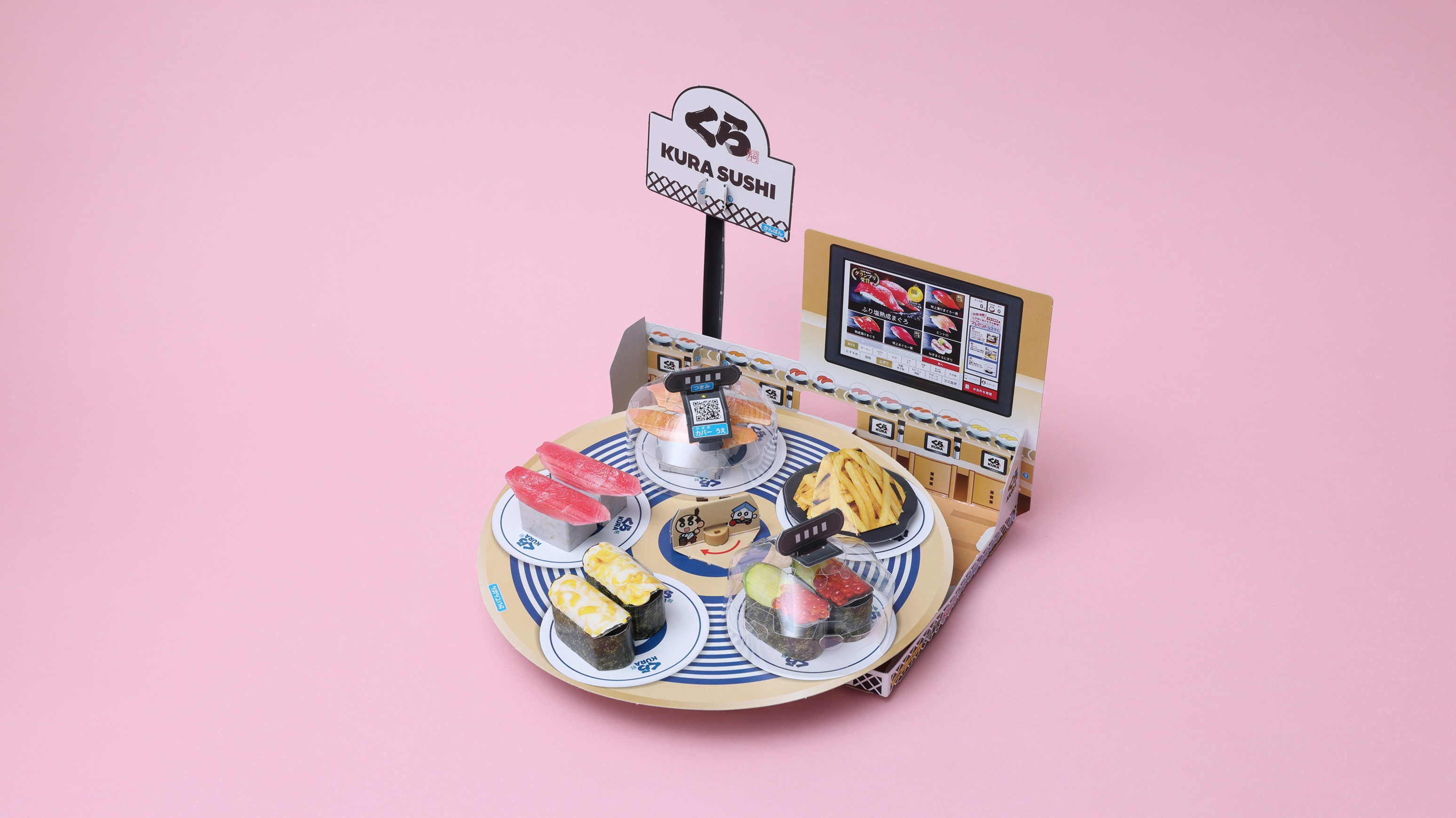 回転するのは、子どもに人気の寿司ネタ(熟成まぐろ、あぶりチーズサーモン、たまご焼き、いくら、コーン、ハンバーグ)に加え、“くらポテト”、“特製茶碗蒸し”で、本物の商品を撮影したものを紙で再現。また、くら寿司のお皿はもちろん、あの“抗菌寿司カバー鮮度くん”も再現するなど、細部にまでこだわった、ワクワクする付録に仕上がっている。