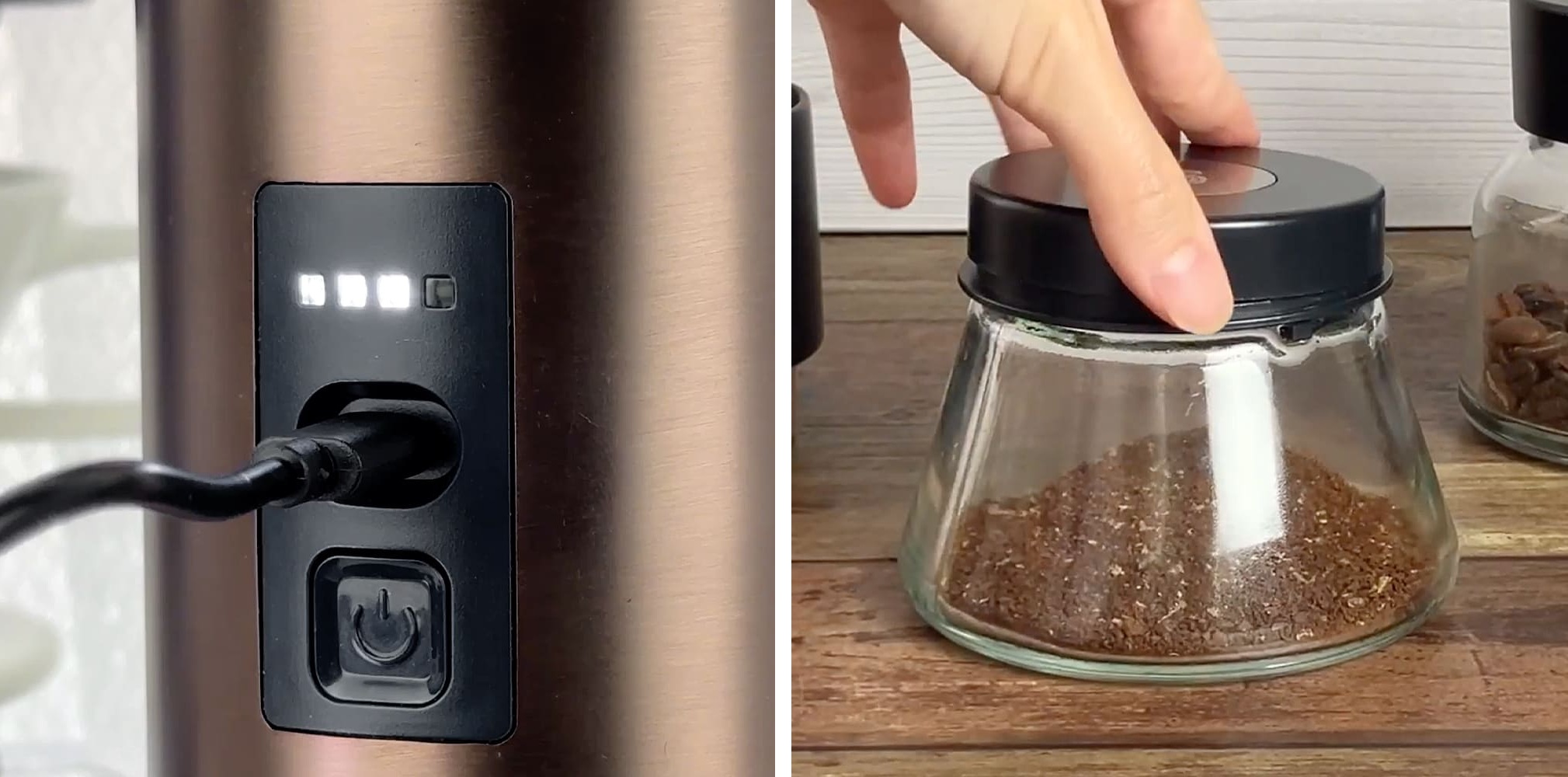 本体下部のガラスコンテナは粉受け兼保存容器として使用可能。密閉性の高いフタを装着すれば、挽きたての香りを逃さず、持ち運びにも最適だ。
