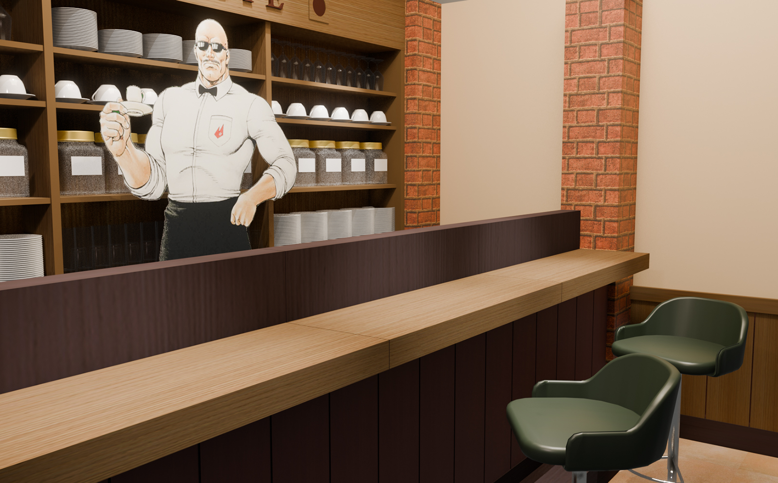 喫茶キャッツアイ。海坊主が営む喫茶キャッツアイの店内には等身大の冴羽獠!