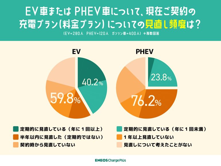 電気自動車の充電プランなどの料金プランの見直し頻度では、EVユーザーの約6割が「定期的な見直しをしていない」と回答しており、PHEVユーザーは約7割超が定期的な見直しをしていないという結果になった。