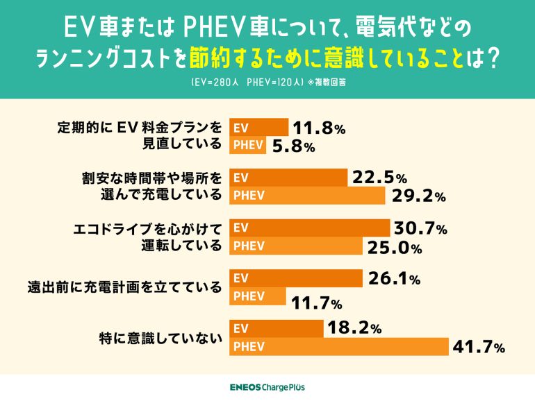 EV/PHEVユーザーは「料金プランの見直し」といった根本的な対策が節約意識に含まれにくく、特にPHEVは“節約そのものを意識しない”傾向が見える結果になった。