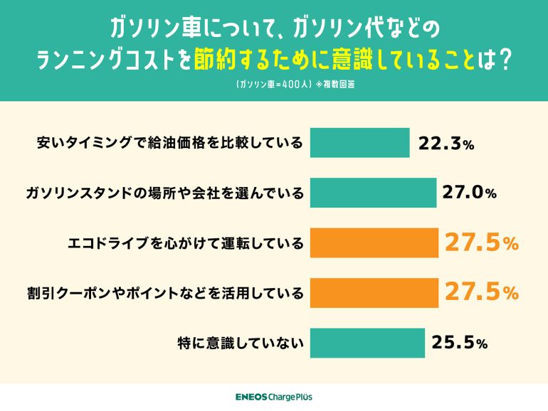 ガソリン車ユーザーの取り組みでは、「エコドライブを心がけて運転している」(27.5%)、「割引クーポンやポイントを活用する」(27.5%)、「スタンドやブランドを比較する」(27.0%)、「給油タイミングを調整する」(22.3%)といった日常的に実行可能で効果の出やすい節約行動を複数取り入れて、着実にコストを抑えようとする姿勢が見える回答になった。