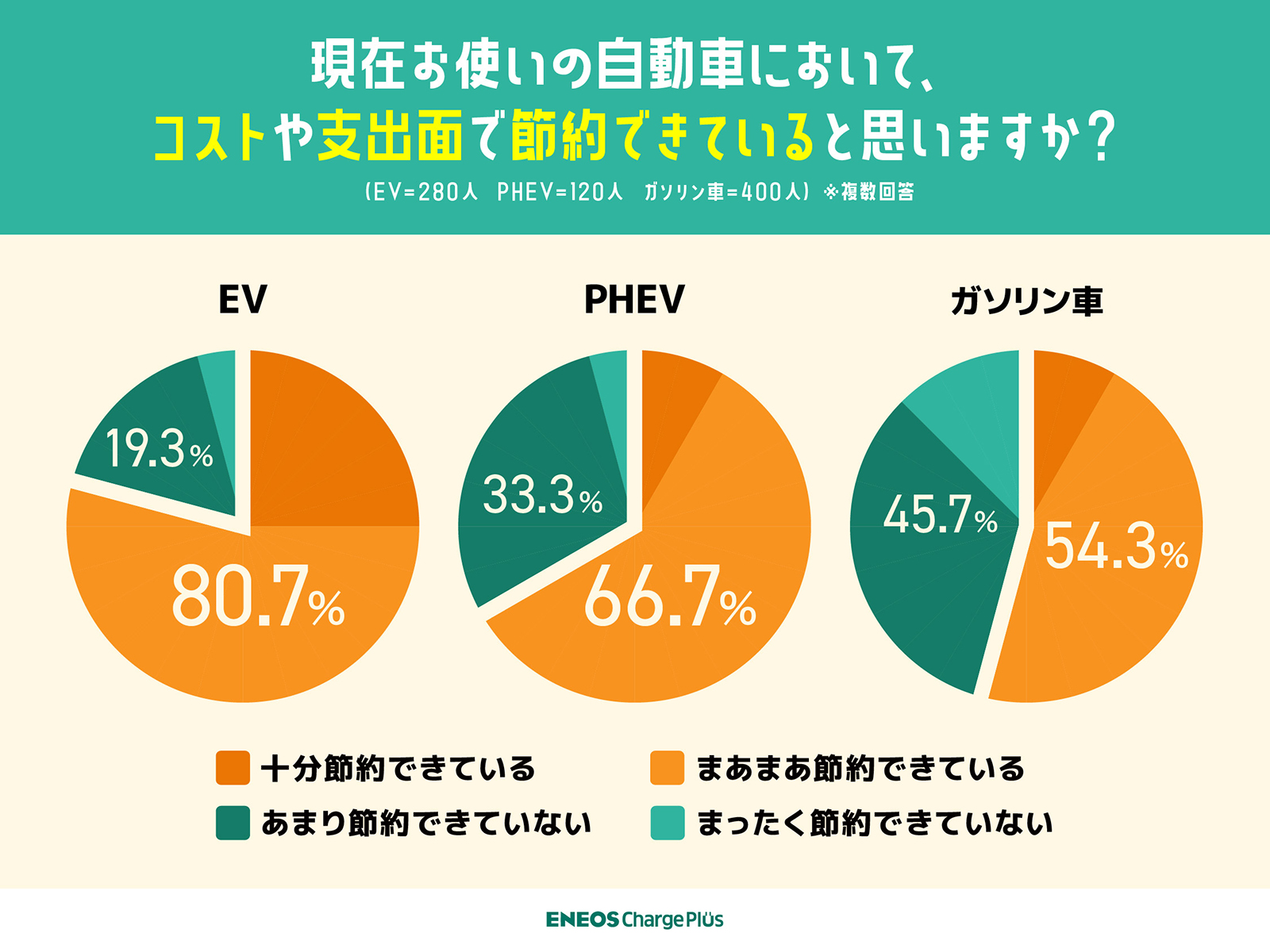 自動車に関するコストや支出を節約できているか自己評価を質問すると、EVユーザーの80.3%、PHEVユーザーの66.7%が「節約できている」と回答。これはガソリン車ユーザーの54.3%を大きく上回る数字だ。