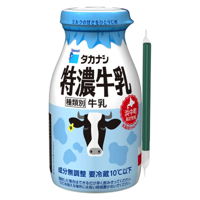 タカナシ「特濃牛乳 200ml(ボトル)」は、北海道の生産者の協力により実現した乳脂肪分4.0%以上の特選規格で、浜中町の指定牧場の生乳だけを使用する「タカナシ 特濃牛乳」を、牛乳ビン型のPETボトルに詰めています。