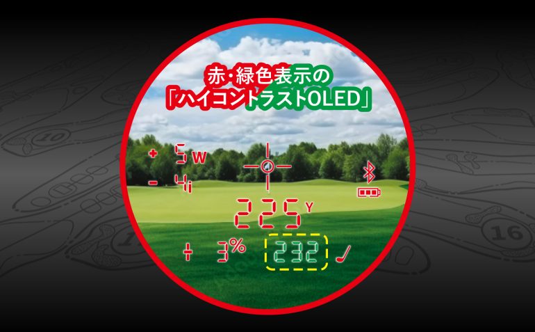 さらに、ピンフラッグ測定可能距離は最大500ヤードで、 目標を正確に捉え、素早く測定することが可能。加えて、ピンシーカー機能が作動した際、本体が振動すると同時に視界上にレッドリングが発光する「ダブルジョルト(バイブレーション)機能」も搭載する。