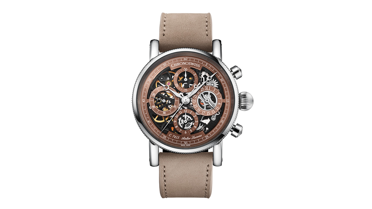 ムーブメントはガルバニックブラックで仕上げられ、完全にスケルトン化された自動巻クロノグラフキャリバーC.741Sを搭載。
