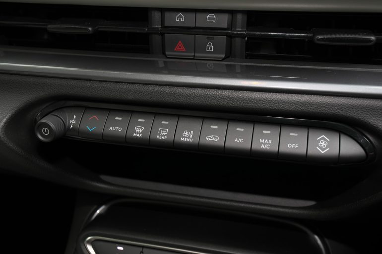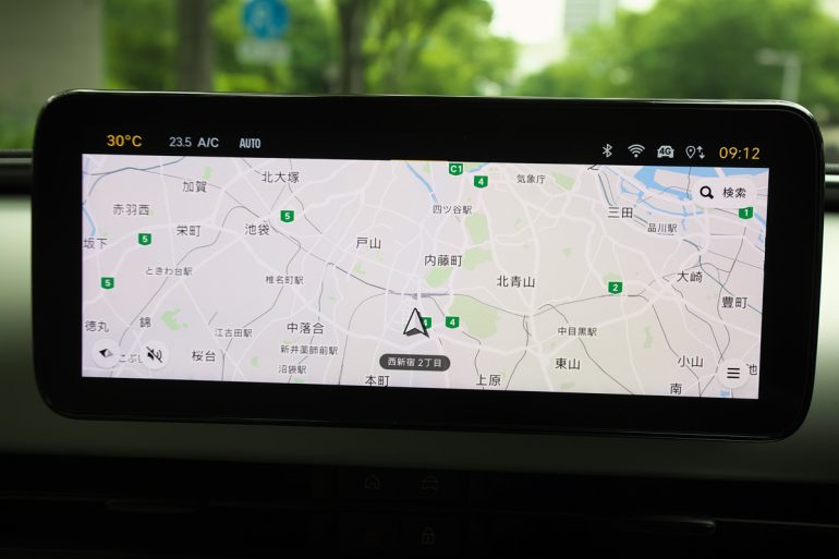 運転席に座りスタート。ATのシフトはセンターパネルのプッシュボタンP/R/N/D・Mを選択する。D/Mレンジを押してスタートする。メーカーの資料によれば、スタートから電動モーターのアシストで、最大30km/hまでモーターでの走行が可能というが、試乗車は常に充電状態が低く、スタートからのEV走行はほとんど体験することはできなかった。