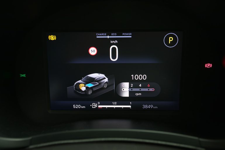 信号待ちの多い市街地では1時間あたり約50%はエンジンを使用しない走行ができるとも書いてあるが、メーターパネル内のエンジン回転計を見ても0を指している時間は少なかった。むしろ、中速域で走行中に交通状況により、エンジンが停止する場面のほうが多かった。
