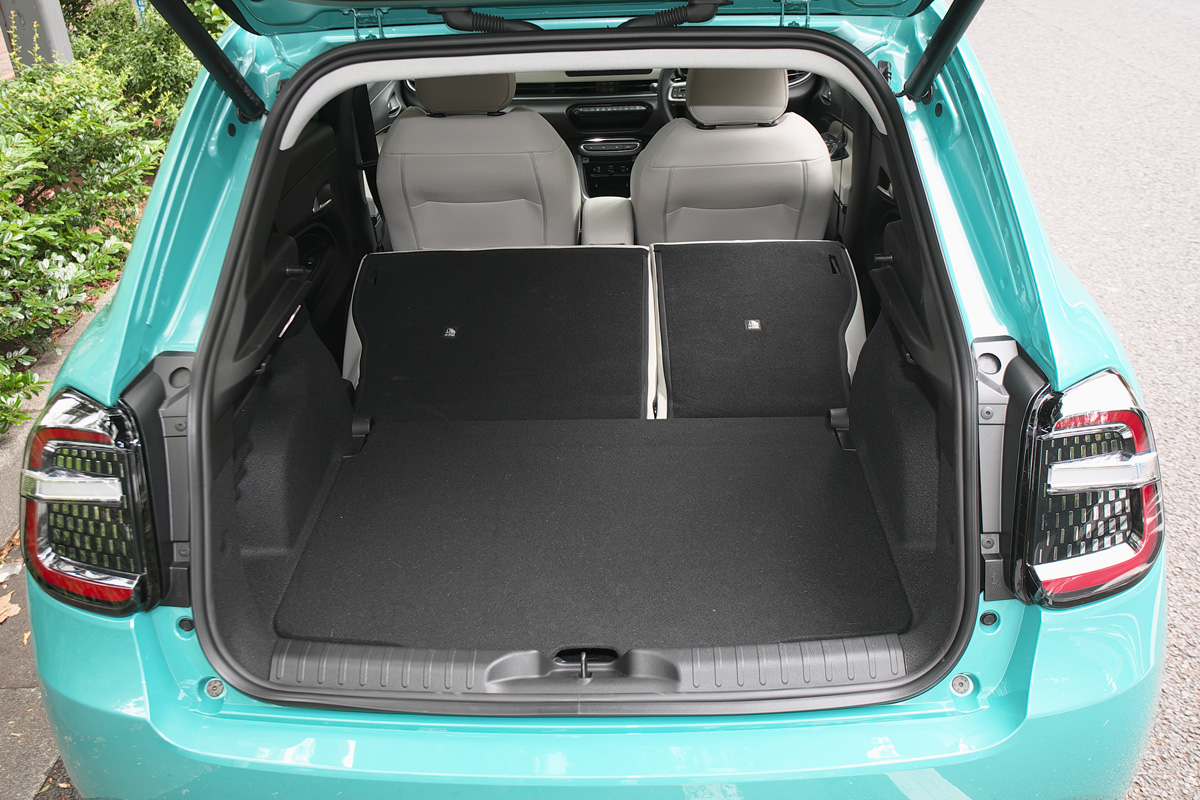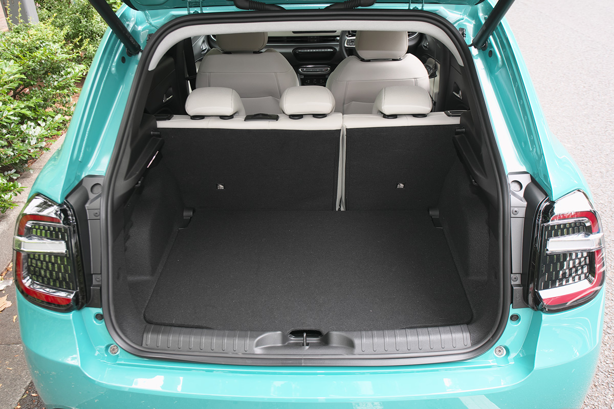 後席は背もたれが6対4で分割前倒しできるが、車体後部の荷室とはフラットにならずやや斜めになる。荷室は奥行き730mm、左右幅970~1180mm。床板の下には高さ10cmのサブスペースがあり、さらにその下のボードを開けると、深さ約210mmぐらいのスペアタイヤが収納されていた部分がそのまま空間になっている。ここは内張りもないので、荷室にはならないが、ウエスなどの収納場所としては使えそうだ。