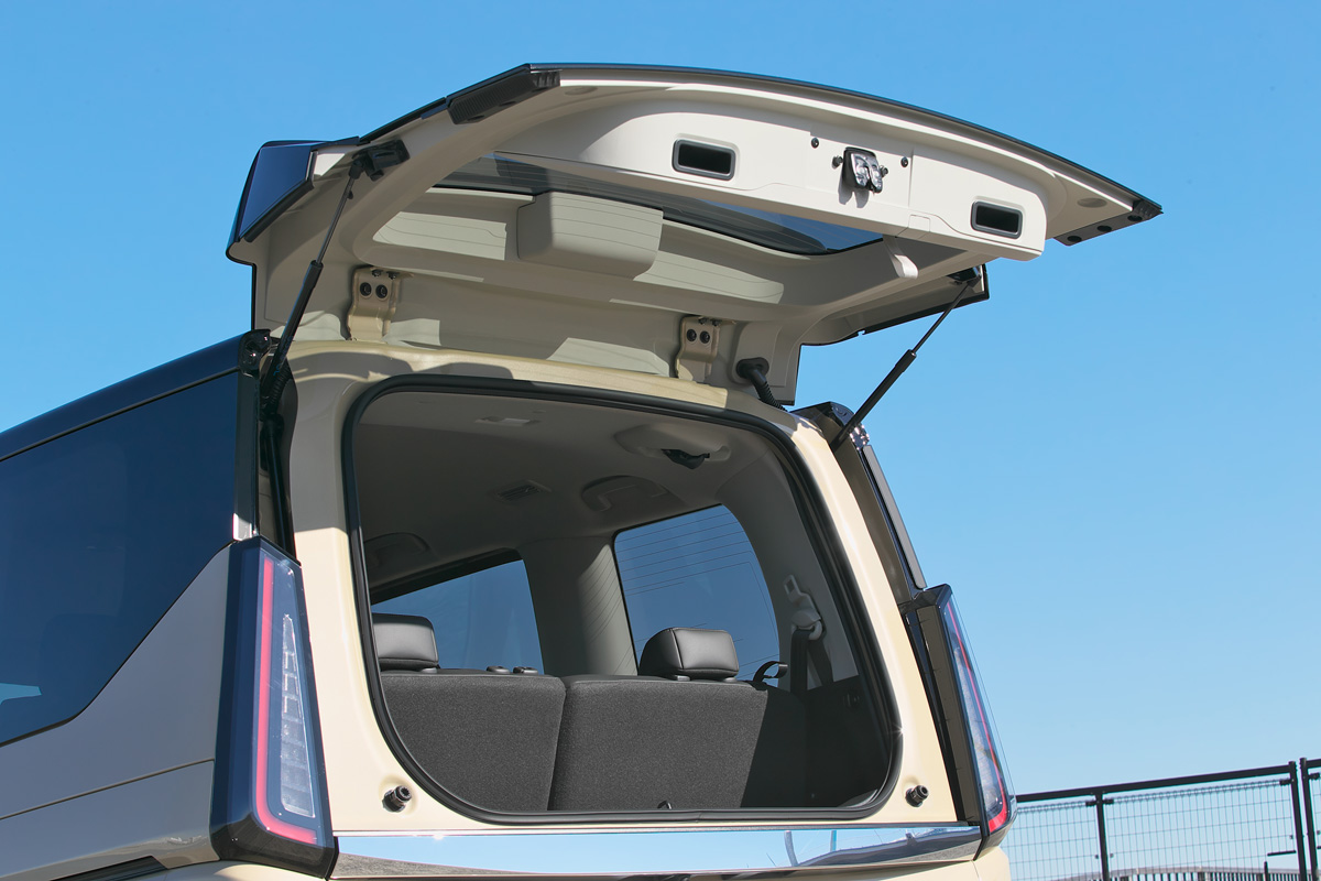 ラゲージスペースは3列目を使用した状態だと奥行きは約380mmだが、3列目を左右にハネ上げると、1100mmの長さが確保される。