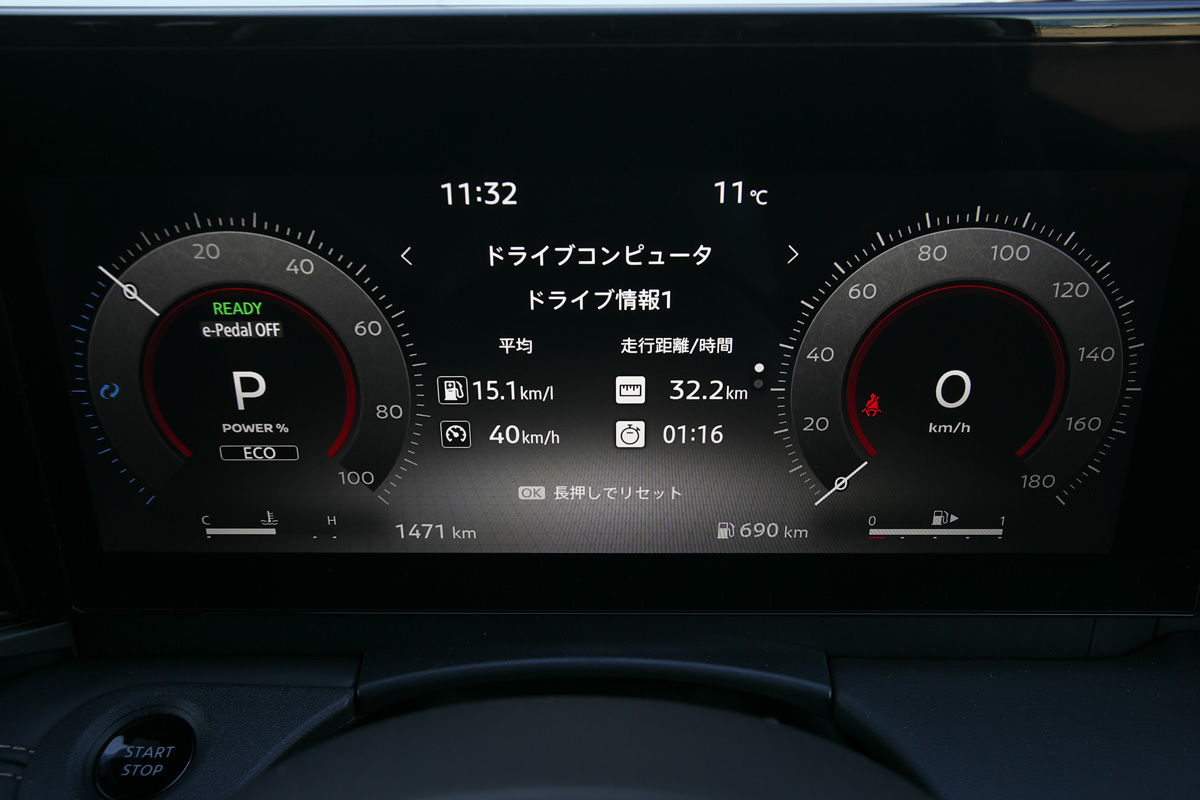 「スタンダード」で走り始める。スタートからタイムラグなく、動き出す。フロント163PS/315Nm、リア82PS/195Nmのモーターが駆動を開始する。日産の電動車は、エンジンはモーターへの電力供給に使い、駆動には使われていない。この方式が日産のEVの考え方のひとつだ。電池の充電量が減ってくると、充電のためにエンジンがかかる。振動とうなり音はやや大きめ。運転をしているとそれがわかる。
