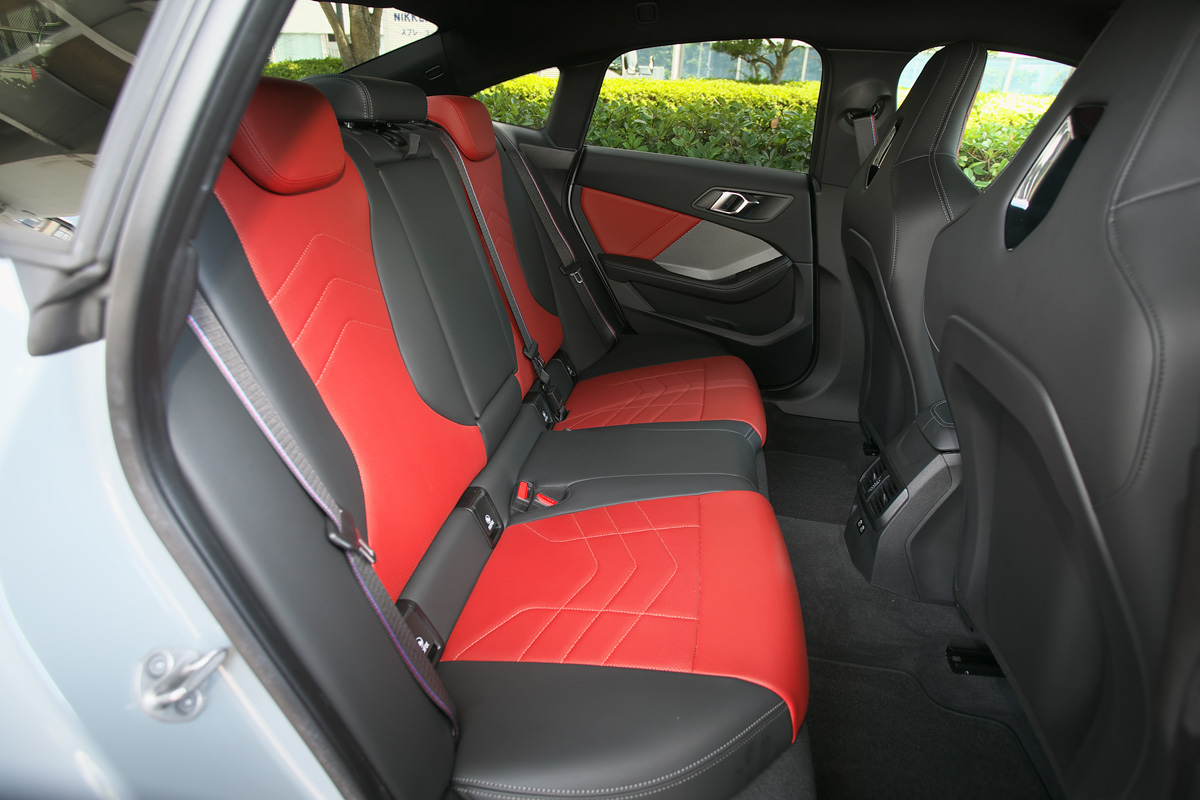 「M235グランクーペ」の前席は低めの着座位置。運転席のハンドルもチルトの位置が低いので必然的にドライビングポジションは低い着座になってしまう。後席の着座位置はやや高め。