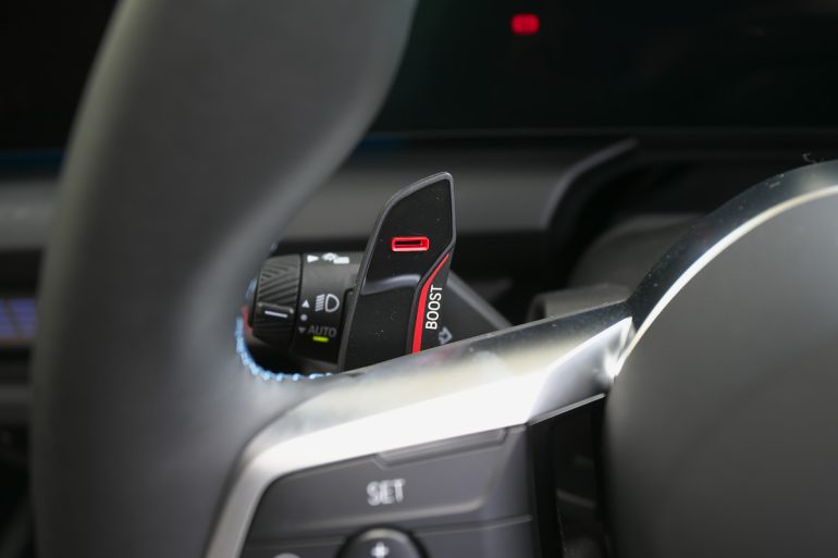 Dレンジ、パーソナルモードで走り出す。Mチューンのパワーユニットは2500回転を境に、エキゾースト音とトルクが増すセッティング。
