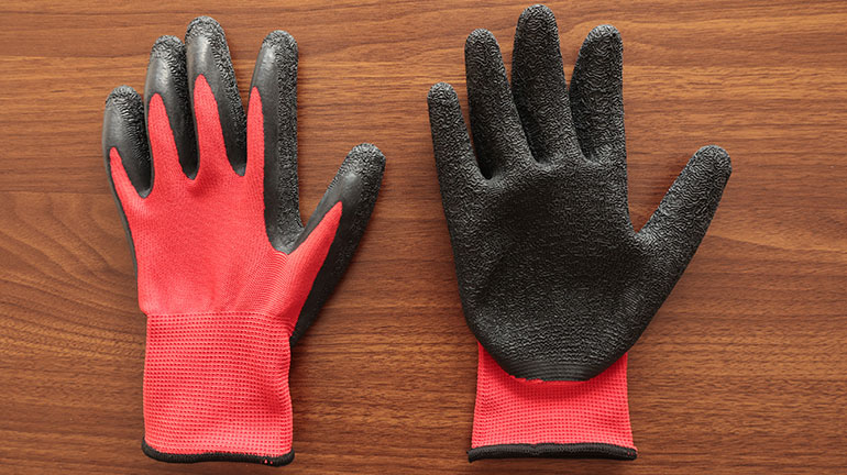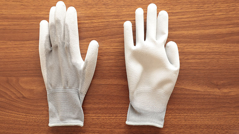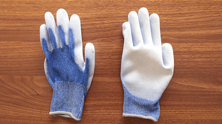ニトリルゴムとは合成ゴムの1種で、使い捨て手袋の素材によく用いられる。これをコーティングした背抜き手袋で、耐油性があるのが特徴。また、天然ゴムのアレルギーがある人も不安なく使える。滑らかで光沢があるため、防滑性が劣るかと思ったが、割としっかりモノをつかめる。重量物を扱わない軽作業に向いていそうだ。