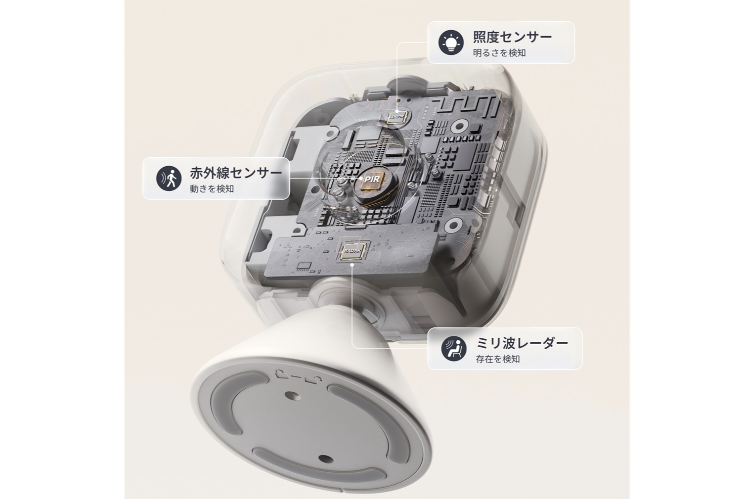 従来の赤外線センサー(PIR)と照度センサーに加え、静止中の人体も検知できるミリ波レーダーを新たに搭載。ミリ波レーダーは、呼吸などのわずかな動きも検知するので、トイレでじっとしているときや玄関で靴紐を結んでいるときに、ライトが突然消えてしまうといった事態を防ぐことができる。