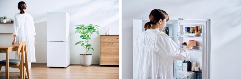 「2ドア冷凍冷蔵庫(HR-E914W/HR-E918W)」は、そのようなユーザーの声に応えるため、省エネと静音を実現し、使いやすい大容量冷凍室と、生活空間になじむシンプルデザインを両立した、2ドア冷凍冷蔵庫。庫内容量140Lの「HR-E914W」と、178Lの「HR-E918W」の2機種をラインナップし、ひとり暮らしのライフスタイルに合わせてサイズを選ぶことができる。