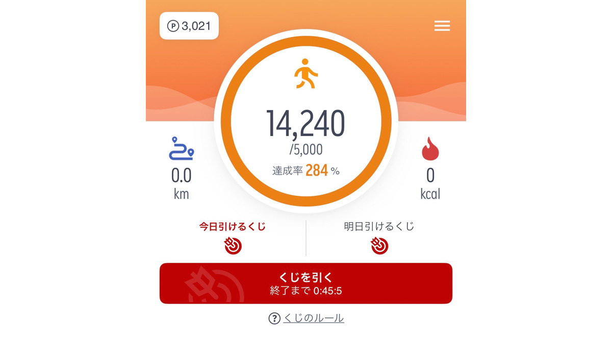 1日5,000歩以上歩くと次の日くじを引くことができ、1ポイント~10ポイントが当たります。ハズレありということになっているのですが、僕は1年以上ほぼ毎日くじを引いていて1回もハズレたことはありません。