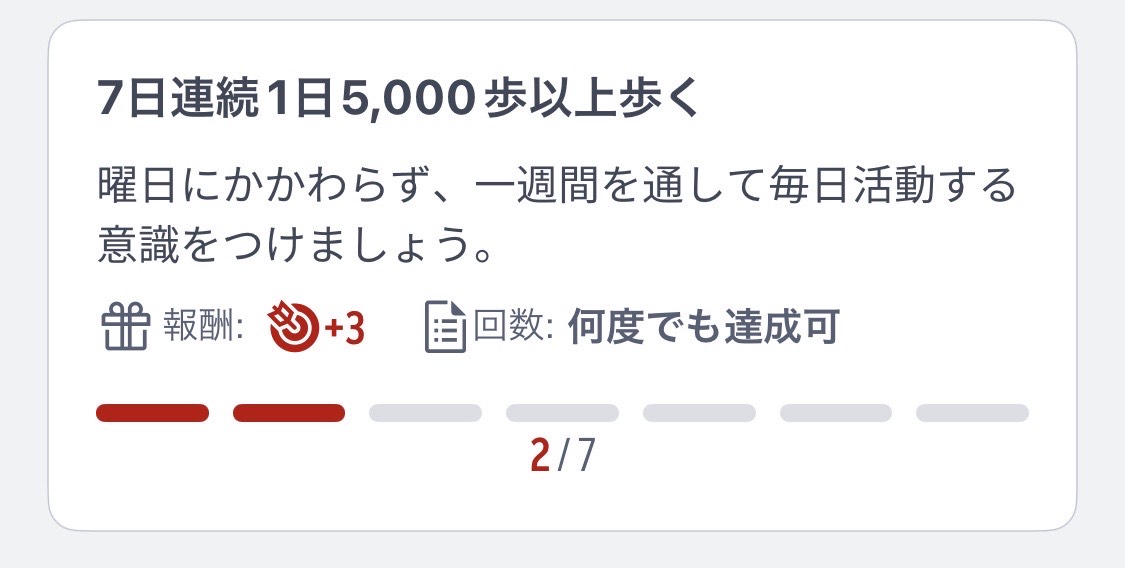 通常は1日5,000歩以上歩くと1回くじを引くことができるところ、7日連続1日5,000歩以上歩くと3回プラスされて合計4回引くことができます。