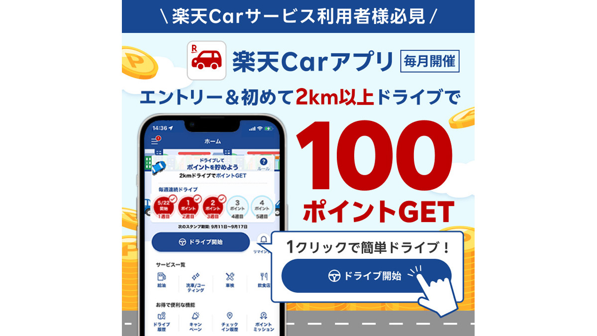 1日1回参加することができ、毎週ドライブ機能を利用するとボーナスポイントがもらえます。さらに今ならエントリーして初めて2km以上ドライブすると、100ポイントもらえるキャンペーンが開催中です。