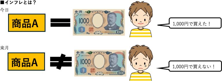 モノの価格が上がっていくと、今日1,000円でA商品を買うことができたのに、翌月に1,030円になっていることがある。そのとき、今日の1,000円札の価値は、A商品を買えるだけの価値があるが、翌月は1,000円札で買えなくなっており、その1,000円札の価値が下がっていることになる。