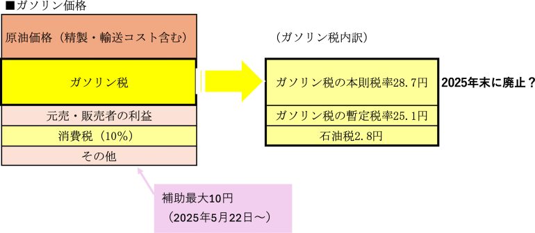 現在、ガソリン価格の上昇を抑えるために、補助として1リットルあたり最大10円の補助が行われている。2026年4月に暫定税率を廃止する予定とし、廃止するまでは補助金も段階的に引き上げ、廃止後に補助金は廃止される見込みだ。
