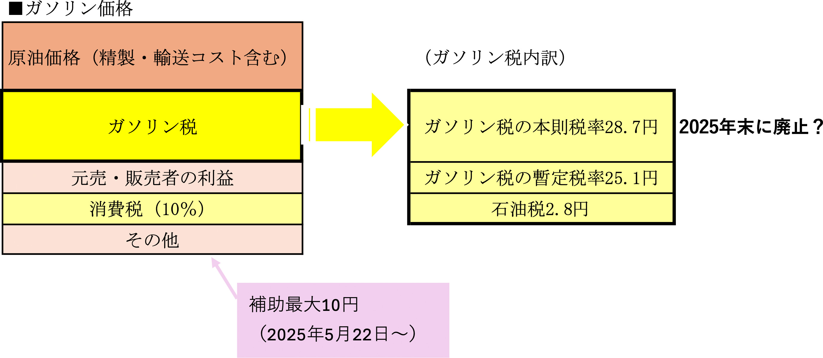 現在、ガソリン価格の上昇を抑えるために、補助として1リットルあたり最大10円の補助が行われている。2026年4月に暫定税率を廃止する予定とし、廃止するまでは補助金も段階的に引き上げ、廃止後に補助金は廃止される見込みだ。