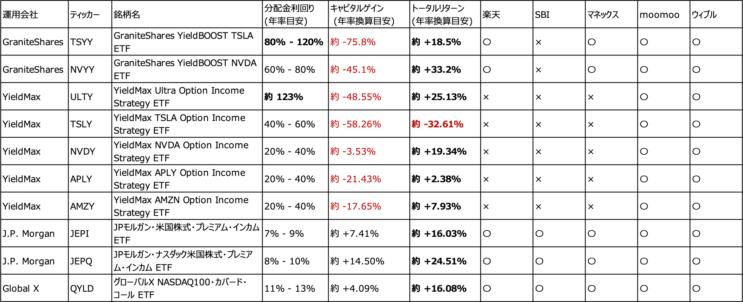 ○イールドマックスや、イールドブーストのリターンと取扱証券会社